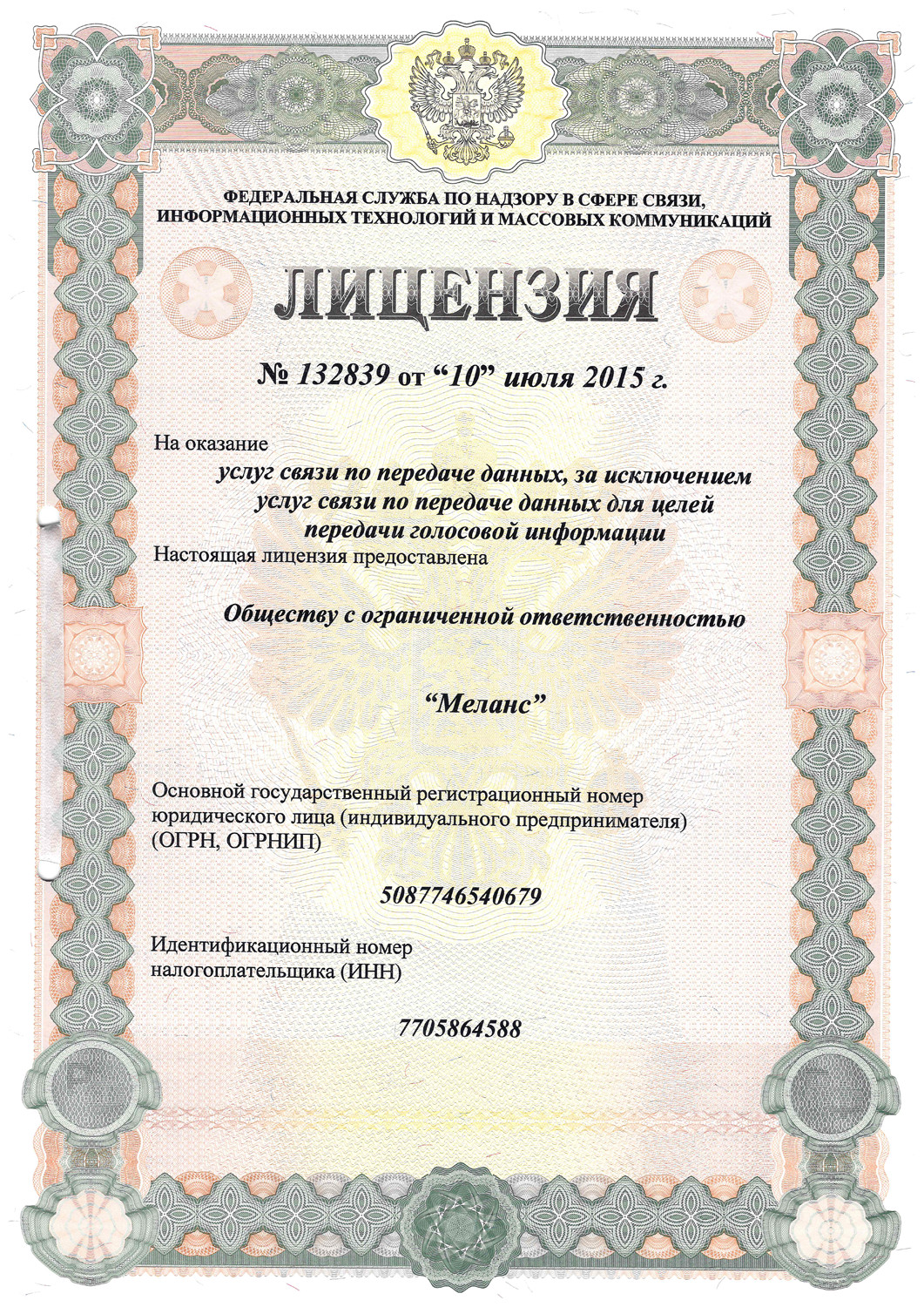 Лицензия на предоставление услуг передачи данных №132839 от 10.07.2015