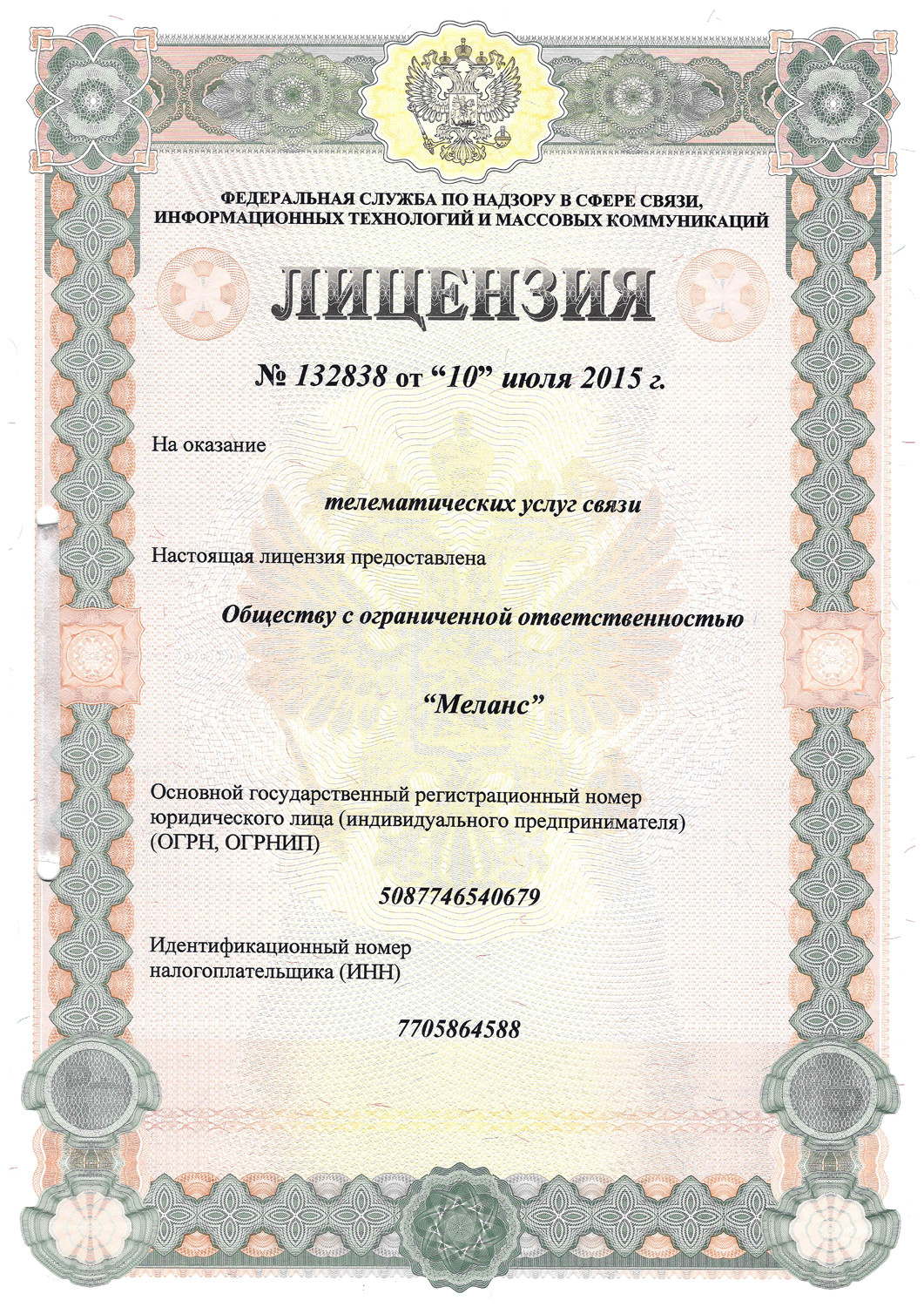 Лицензия на предоставление телематических услуг связи №132838 от 10.07.2015
