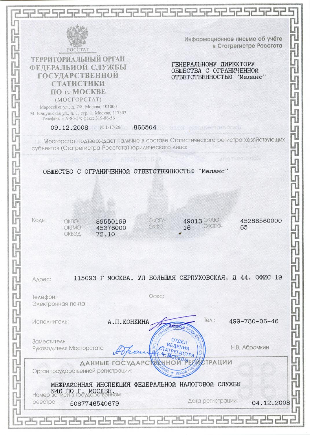 Информационное письмо об учете в регистре Росстата